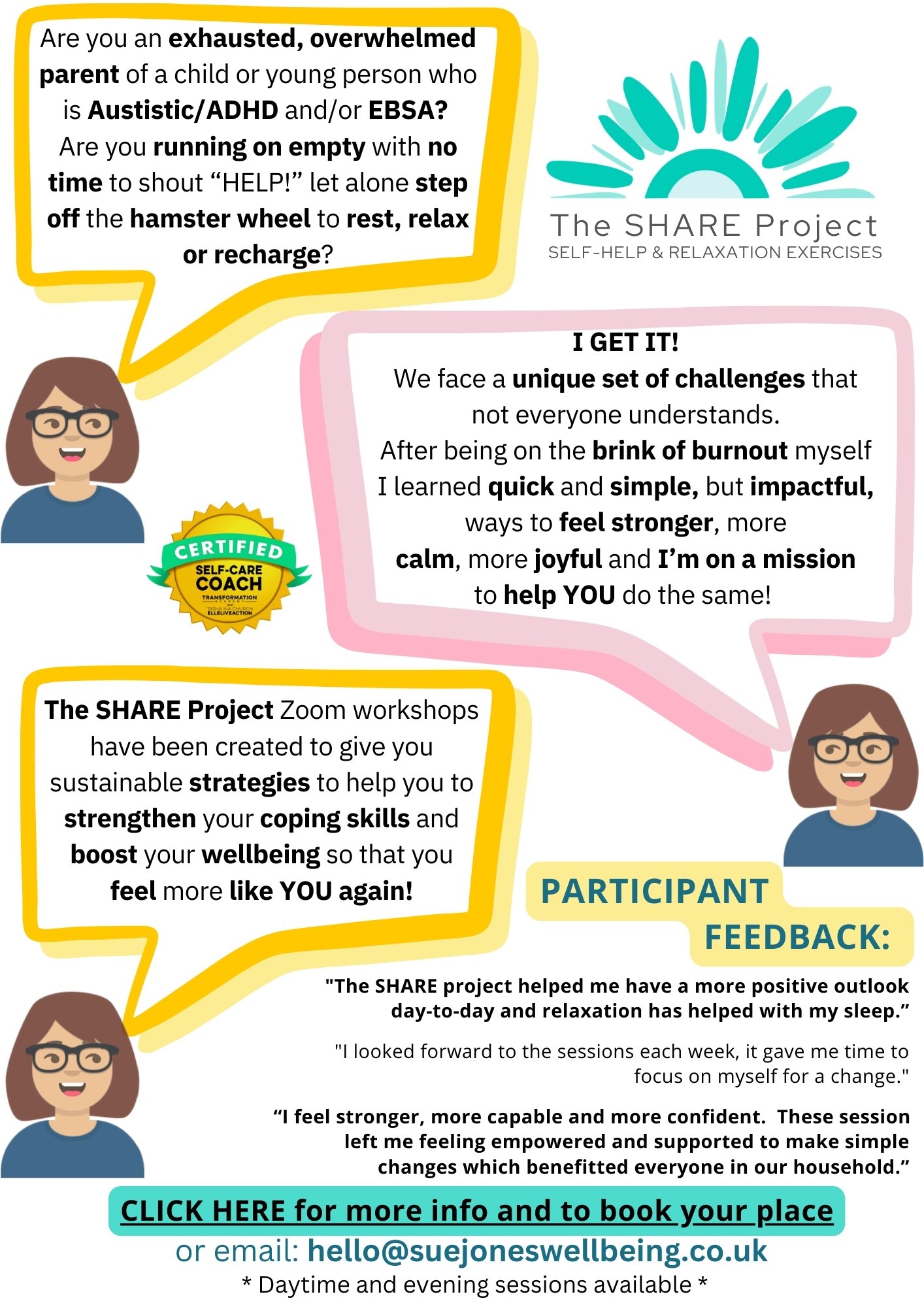 Through practical, action-focused workshops (The SHARE Project) I help parents feel calmer, overcome overwhelm and feel more positive so they're in the best position to support their child.